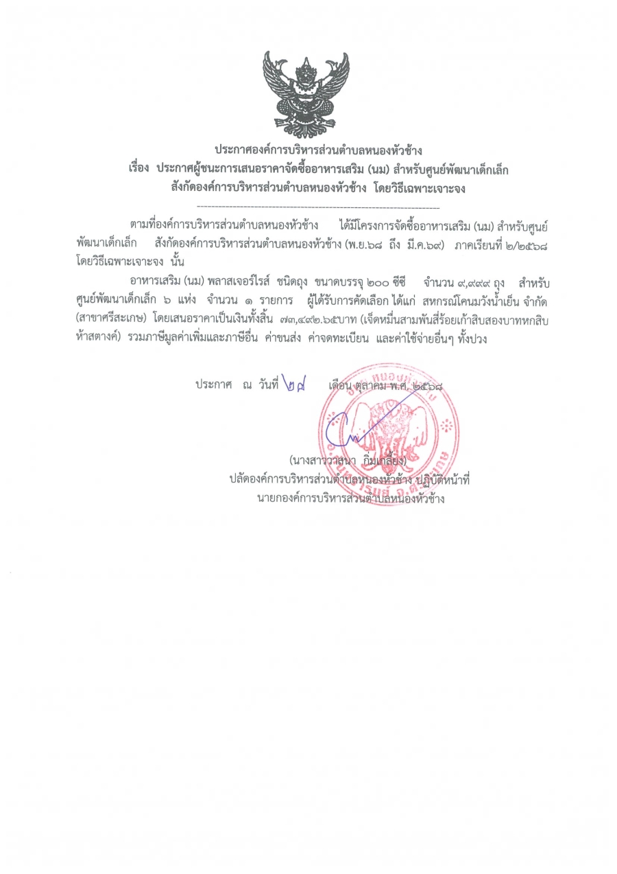 ประกาศองค์การบริหารส่วนตำบลหนองหัวช้าง เรื่อง ประกาศผู้ชนะการเสนอราคาจัดซื้ออาหารเสริม (นม) สำหรับศูนย์พัฒนาเด็กเล็ก สังกัดองค์การบริหารส่วนตำบลหนองหัวช้าง โดยวิธีเฉพาะเจาะจง
