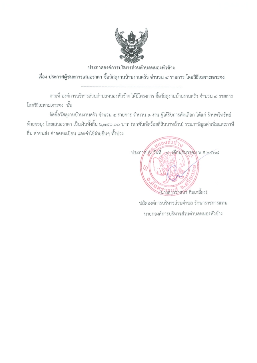 ประกาศองค์การบริหารส่วนตำบลหนองหัวช้าง เรื่อง ประกาศผู้ชนะการเสนอราคาซื้อวัสดุงานบ้านงานครัว จำนวน 4 รายการ โดยวิธีเฉพาะเจาะจง