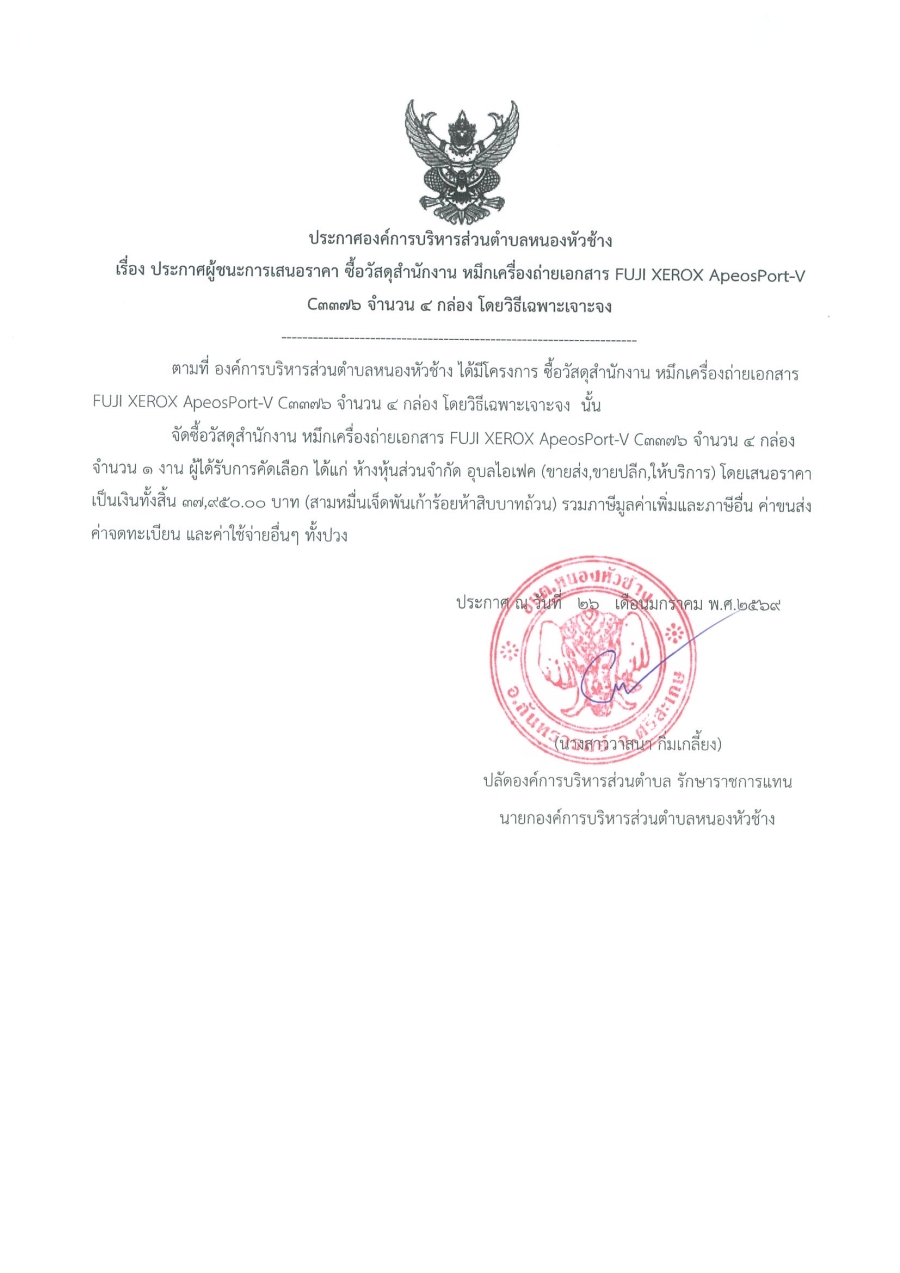 ประกาศองค์การบริหารส่วนตำบลหนองหัวช้าง เรื่อง ประกาศผู้ชนะการเสนอราคา ซื้อวัสดุสำนักงาน หมึกเครื่องถ่ายเอกสาร FUJI XEROX ApeosPort-V C3376 จำนวน 4 กล่อง โดยวิธีเฉพาะเจาะจง