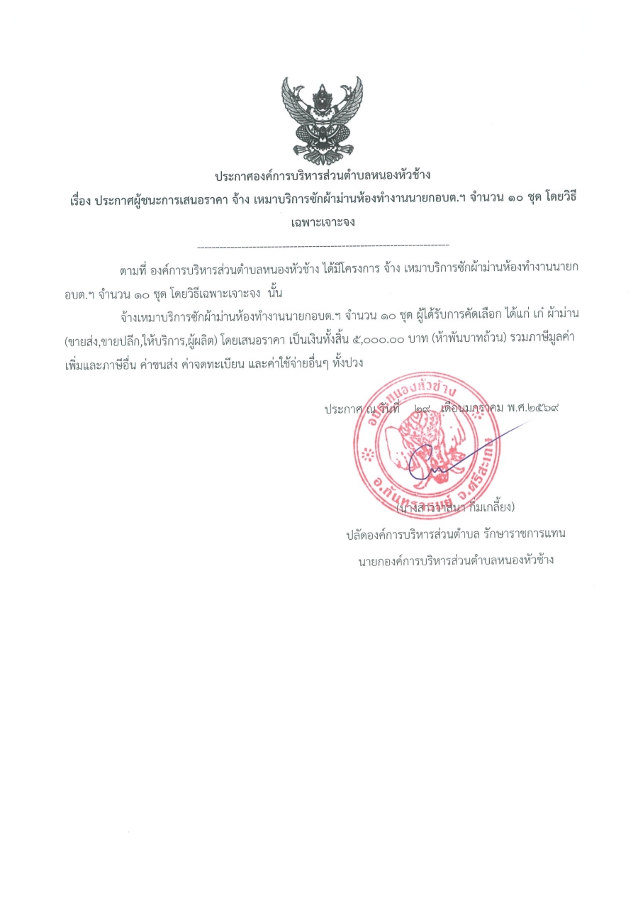 ประกาศองค์การบริหารส่วนตำบลหนองหัวช้าง เรื่อง ประกาศผู้ชนะการเสนอราคา จ้างเหมาบริการซักผ้าม่านห้องทำงานนายก อบต.ฯ จำนวน 10 ชุด โดยวิธีเฉพาะเจาะจง