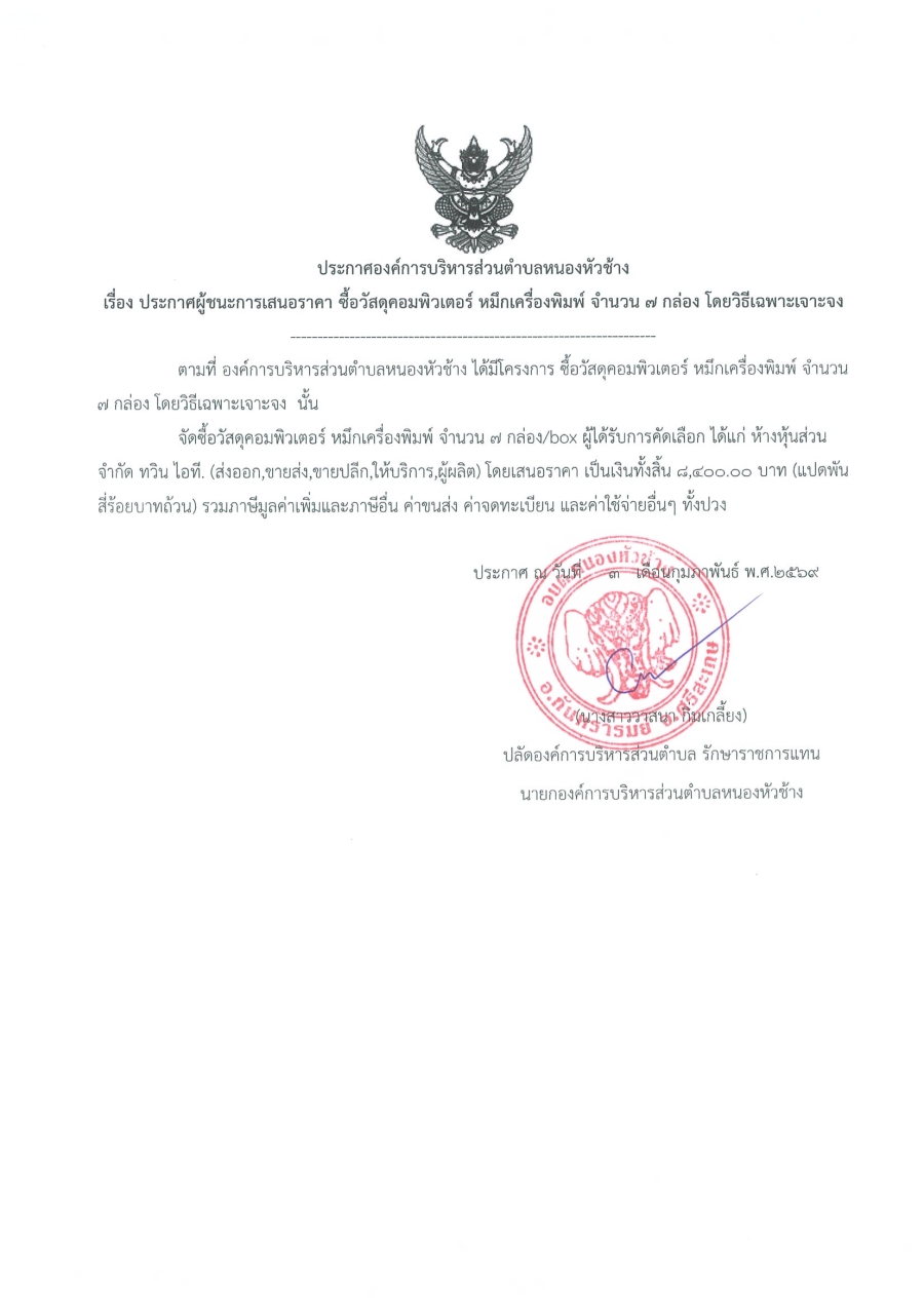 ประกาศองค์การบริหารส่วนตำบลหนองหัวช้าง เรื่อง ประกาศผู้ชนะการเสนอราคา ซื้อวัสดุคอมพิวเตอร์ หมึกเครื่องพิมพ์ จำนวน 7 กล่อง โดยวิธีเฉพาะเจาะจง