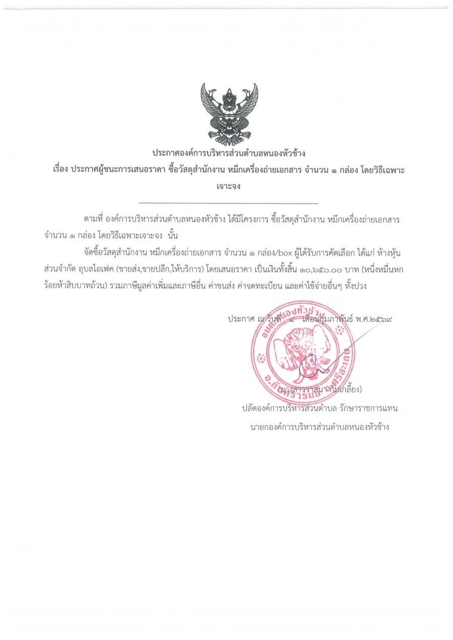 ประกาศองค์การบริหารส่วนตำบลหนองหัวช้าง เรื่อง ประกาศผู้ชนะการเสนอราคา ซื้อวัสดุสำนักงาน หมึกเครื่องถ่ายเอกสาร จำนวน 1 กล่อง โดยวิธีเฉพาะเจาะจง