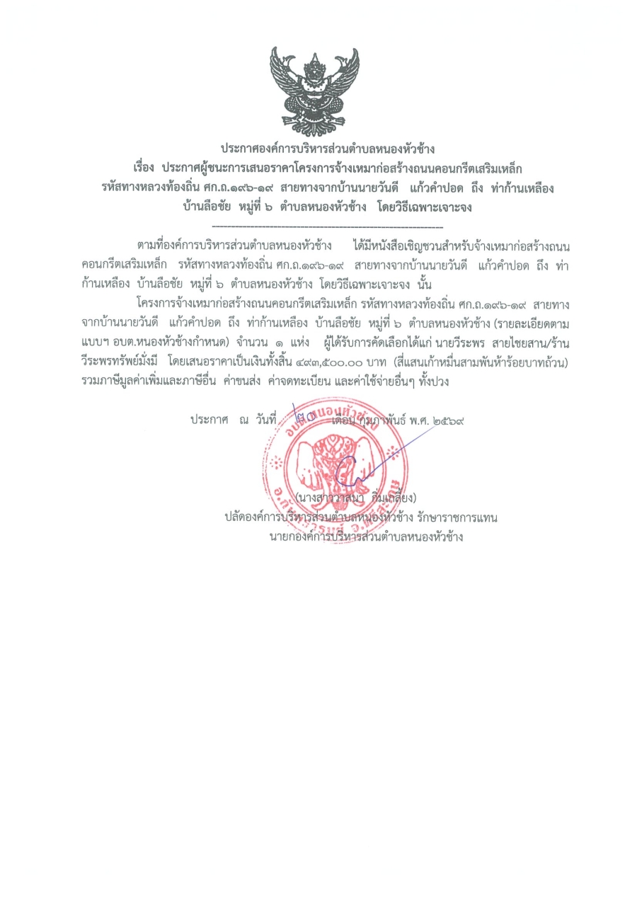 ประกาศองค์การบริหารส่วนตำบลหนองหัวช้าง เรื่อง ประกาศผู้ชนะการเสนอราคา โครงการจ้างเหมาก่อสร้างถนนคอนกรีตเสริมเหล็กรหัสทางหลวงท้องถิ่น ศก.ถ. 196-19 สายทางจากบ้านนายวันดี แก้วคำปอก ถึง ท่าก้านเหลือง บ้านลือชัย หมู่ที่ 6 โดยวิธีเฉพาะเจาะจง