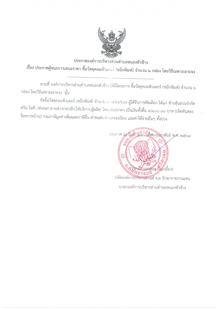 ประกาศองค์การบริหารส่วนตำบลหนองหัวช้าง เรื่อง ประกาศผู้ชนะการเสนอราคา ซื้อวัสดุคอมพิวเตอร์ (หมึกพิมพ์) จำนวน 6 กล่อง โดยวิธีเฉพาะเจาะจง