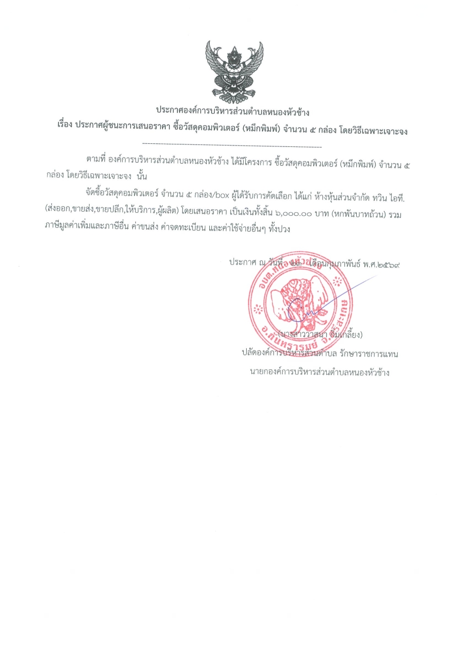ประกาศองค์การบริหารส่วนตำบลหนองหัวช้าง เรื่อง ประกาศผู้ชนะการเสนอราคา ซื้อวัสดุคอมพิวเตอร์ (หมึกพิมพ์) จำนวน 5 กล่อง โดยวิธีเฉพาะเจาะจง
