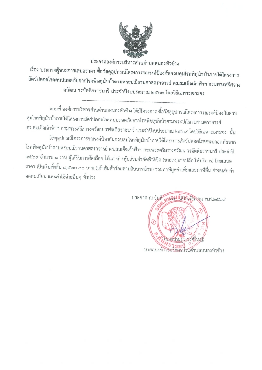 ประกาศองค์การบริหารส่วนตำบลหนองหัวช้าง เรื่อง ประกาศผู้ชนะการเสนอราคา ซื้อวัสดุอุปกรณ์โครงการรณรงค์ป้องกันควบคุมโรคพิษสุนัขบ้าภายใต้โครงการสัตว์ปลอดโรคคนปลอดภัยจากโรคพิษสุนัขบ้าตามพระปณิธานศาสตราจารย์ ดร.สมเด็จเจ้าฟ้าฯ กรมพระศรีสวางควัฒน วรขัติยราชนารี ประจำปีงบประมาณ 2569 โดยวิธีเฉพาะเจาะจง