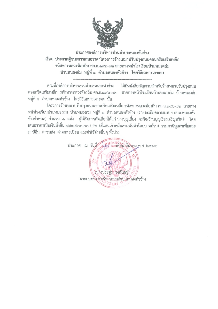 ประกาศองค์การบริหารส่วนตำบลหนองหัวช้าง เรื่อง ประกาศผู้ชนะการเสนอราคา โครงการจ้างเหมาก่อสร้างถนนคอนกรีตเสริมเหล็กรหัสทางหลวงท้องถิ่น ศก.ถ. 196-02 สายทางหน้าโรงเรียนบ้านหนองถ่ม หมู่ที่ 1 ตำบลหนองหัวช้าง โดยวิธีเฉพาะเจาะจง