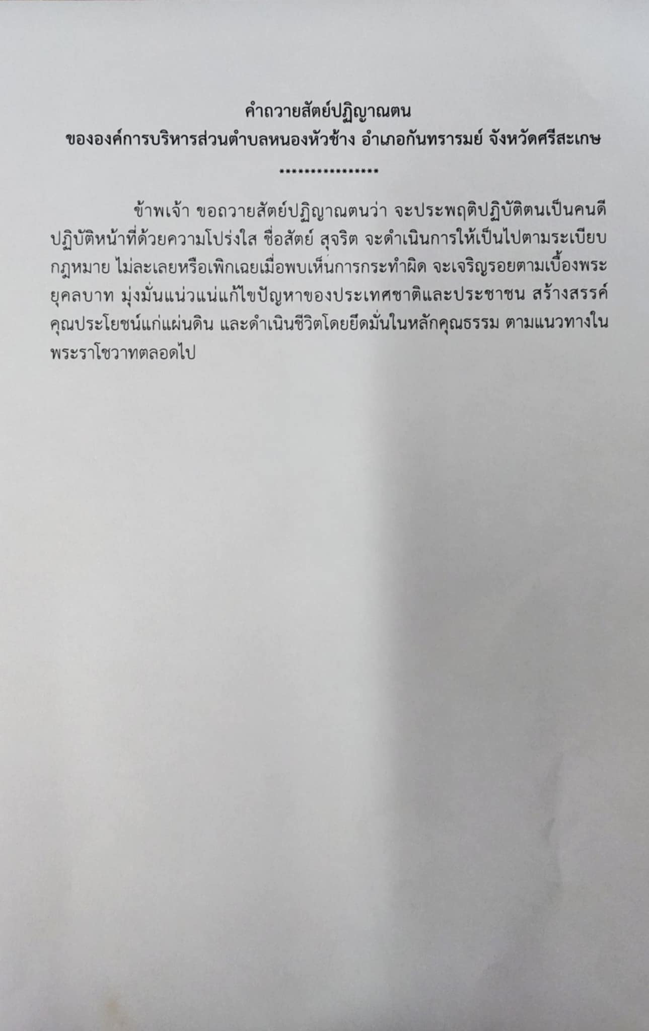 กิจกรรมกล่าวคำปฏิญาณตนและประกาศต่อต้านการทุจริตตามประมวลจริยธรรมบุคลากรขององค์การบริหารส่วนตำบลหนองหัวช้าง