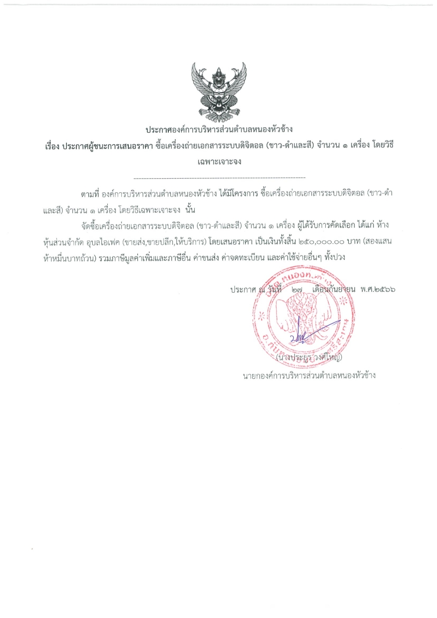 ประกาศองค์การบริหารส่วนตำบลหนองหัวช้าง เรื่อง ประกาศผู้ชนะการเสนอราคา ซื้อเครื่องถ่ายเอกสารระบบดิจิตอล (ขาว - ดำ และสี) จำนวน 1 เครื่อง โดยวิธีเฉพาะเจาะจง
