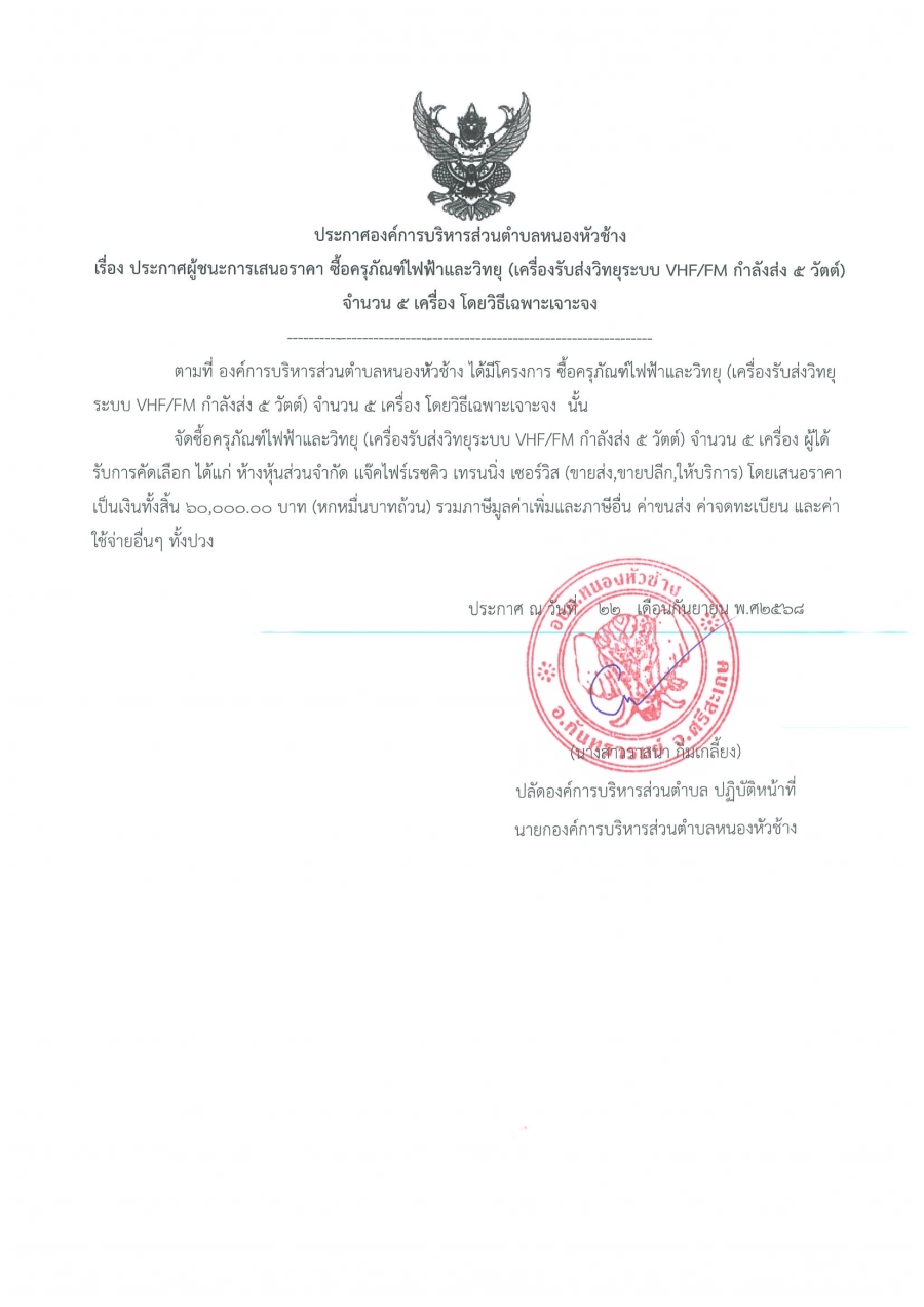 ประกาศองค์การบริหารส่วนตำบลหนองหัวช้าง เรื่อง ประกาศผู้ชนะการเสนอราคา จัดครุภัณฑ์ไฟฟ้าและวิทยุ (เครื่องรับส่งวิทยุระบบ VHF/FM กำลังส่ง 5 วัตต์ ) จำนวน 5 เครื่อง โดยวิธีเฉพาะเจาะจง