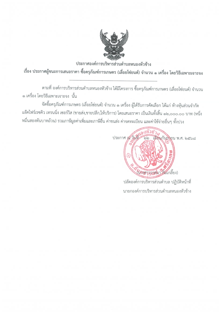 ประกาศองค์การบริหารส่วนตำบลหนองหัวช้าง เรื่อง ประกาศผู้ชนะการเสนอราคา ซื้อครุภัณฑ์การเกษตร (เลื่อยโซ่ยนต์) จำนวน 1 เครื่อง โดยวิธีเฉพาะเจาะจง