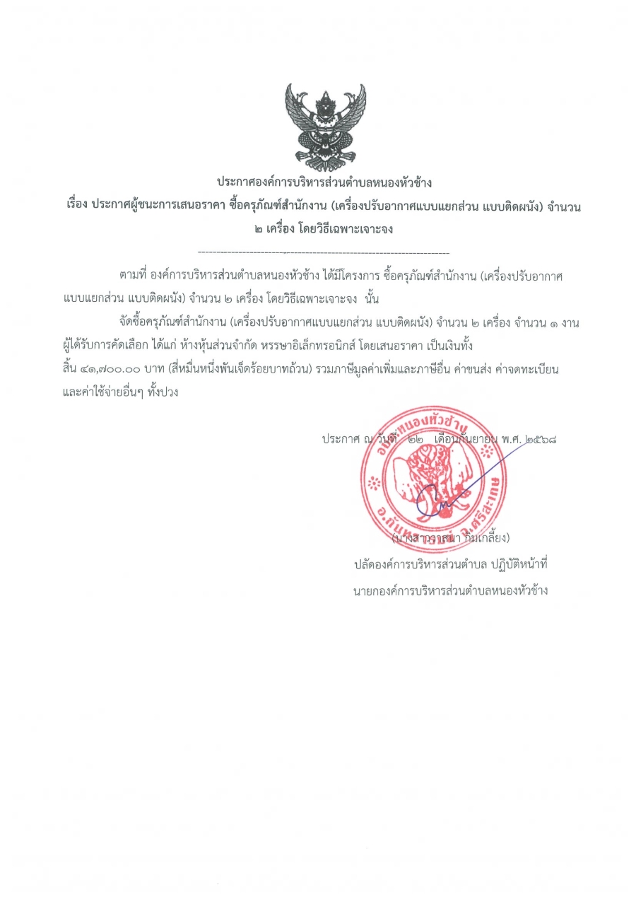 ประกาศองค์การบริหารส่วนตำบลหนองหัวช้าง เรื่อง ประกาศผู้ชนะการเสนอราคา ซื้อครุภัณฑ์สำนักงาน (เครื่องปรับอากาศแบบแยกส่วน แบบติดผนัง) จำนวน 2 เครื่อง โดยวิธีเฉพาะเจาะจง