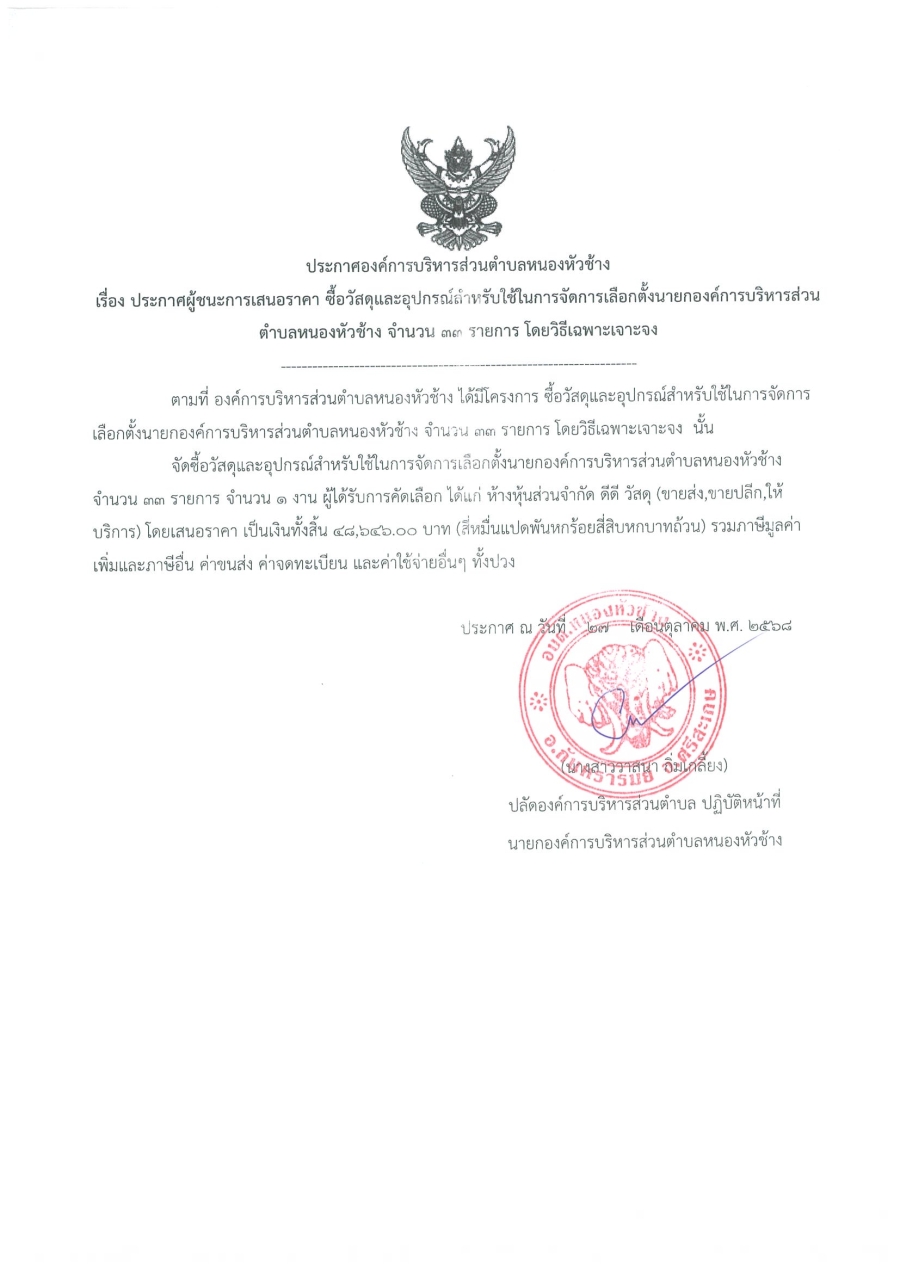 ประกาศองค์การบริหารส่วนตำบลหนองหัวช้าง เรื่อง ประกาศผู้ชนะการเสนอราคาจัดซื้อวัสดุและอุปกรณ์สำหรับใช้ในการจัดการเลือกตั้งนายกองค์การบริหารส่วนตำบลหนองหัวช้าง จำนวน 33 รายการ โดยวิธีเฉพาะเจาะจง
