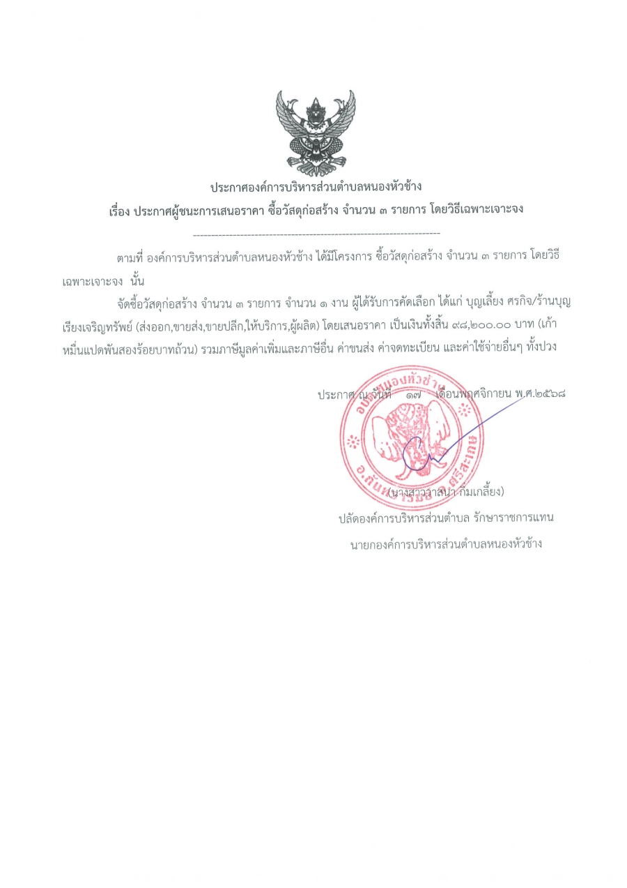 ประกาศองค์การบริหารส่วนตำบลหนองหัวช้าง เรื่อง ประกาศผู้ชนะการเสนอราคาซื้อวัสดุก่อสร้าง จำนวน 3 รายการ โดยวิธีเฉพาะเจาะจง