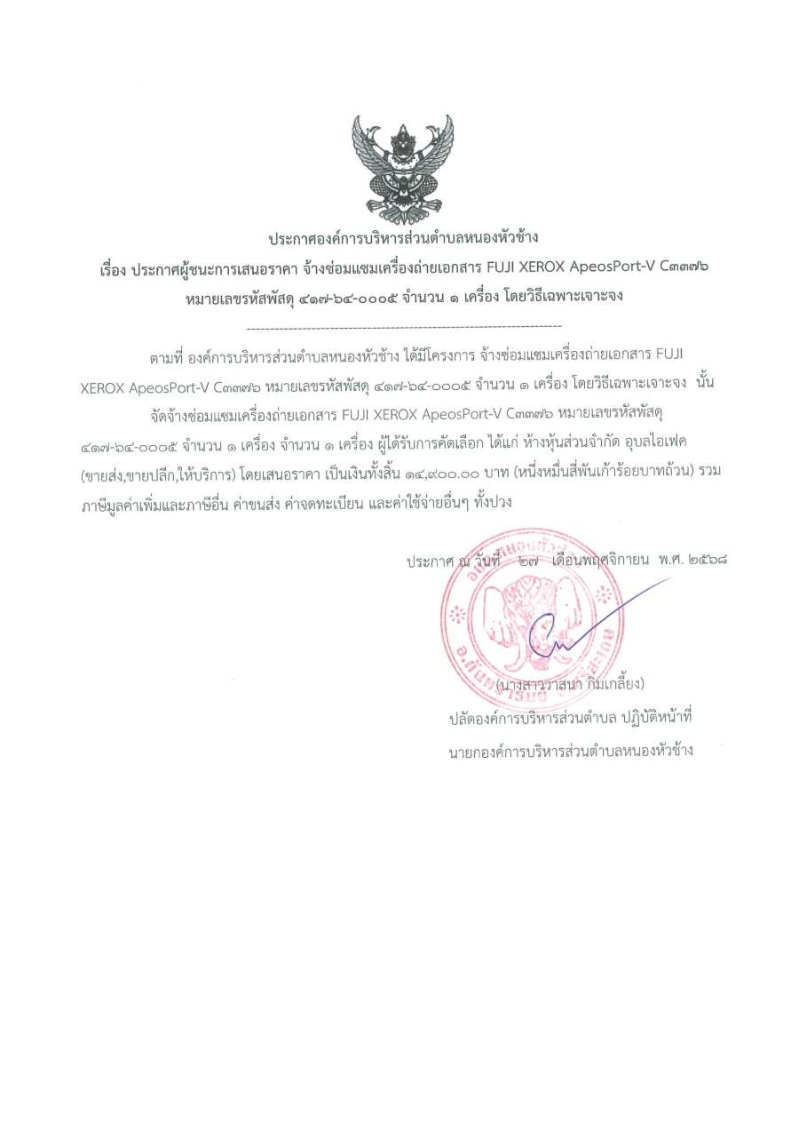 ประกาศองค์การบริหารส่วนตำบลหนองหัวช้าง เรื่อง ประกาศผู้ชนะการเสนอราคาจ้างซ่อมแซมเครื่องถ่ายเอกสาร FUJI XEROX ApeosPort-V C3376 หมายเลขรหัสพัสดุ 417-64-0005 จำนวน 1 เครื่อง โดยวิธีเฉพาะเจาะจง
