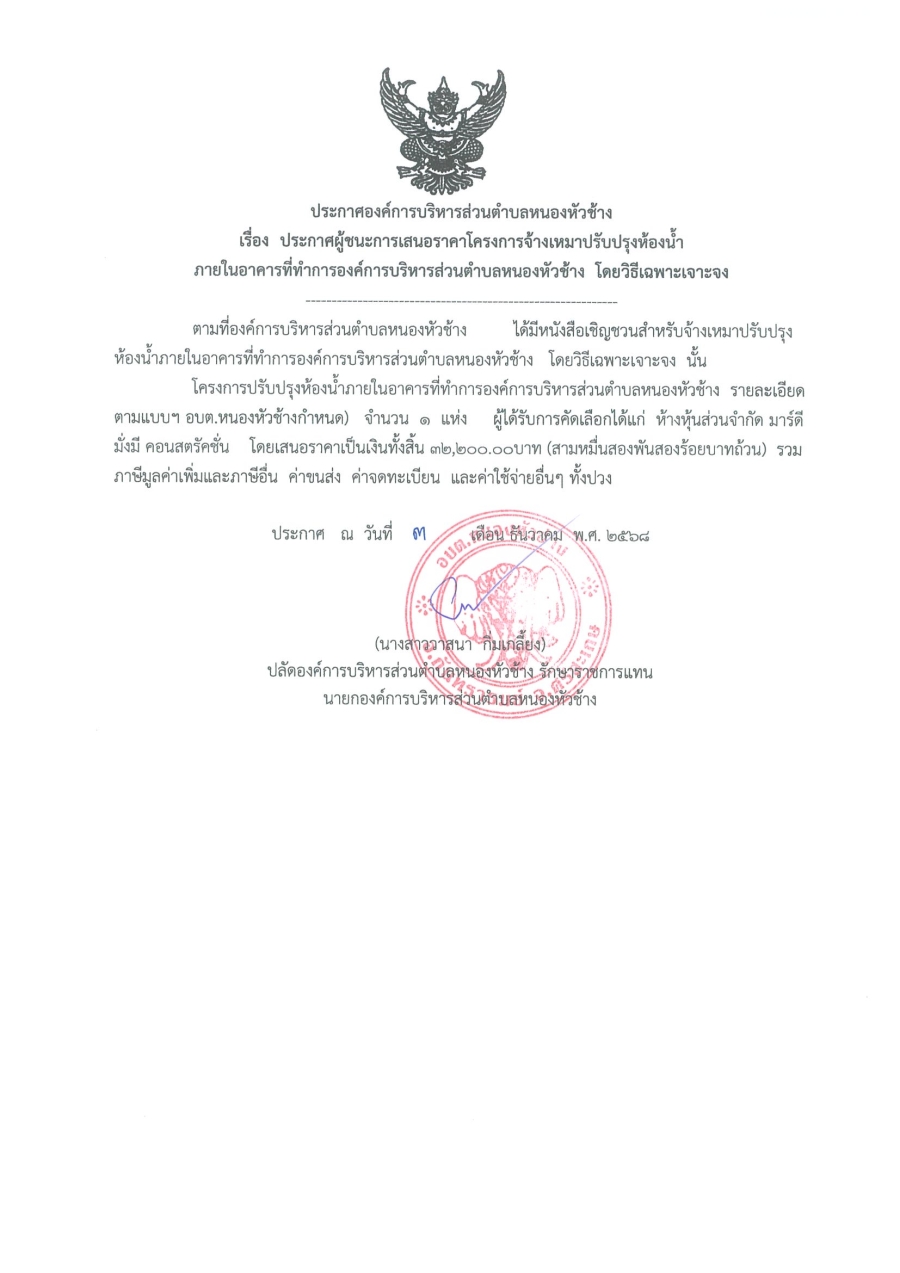 ประกาศองค์การบริหารส่วนตำบลหนองหัวช้าง เรื่อง ประกาศผู้ชนะการเสนอราคาโครงการจ้างเหมาปรับปรุงห้องน้ำภายในอาคารที่ทำการองค์การบริหารส่วนตำบลหนองหัว้ชาง โดยวิธีเฉพาะเจาะจง