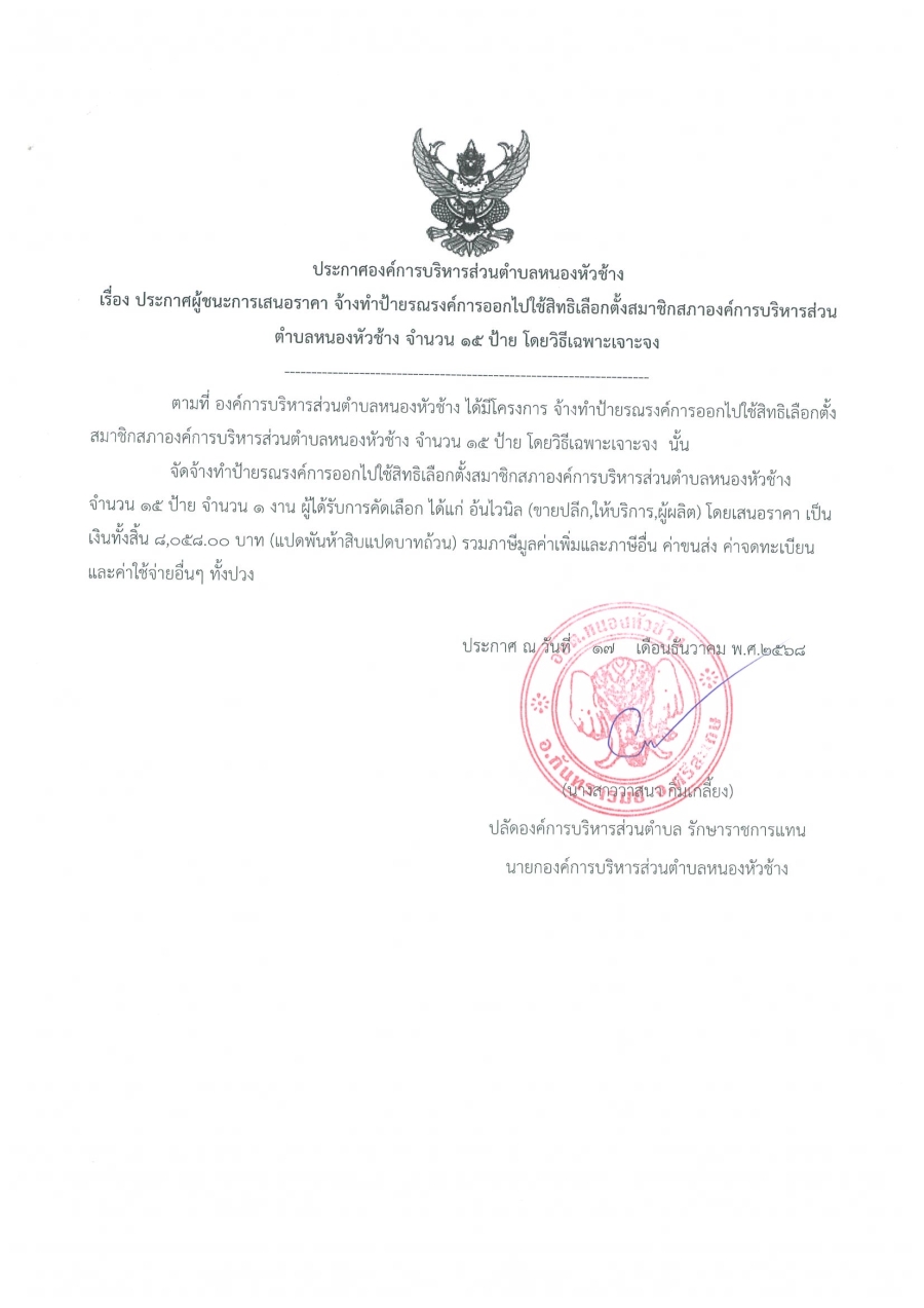 ประกาศองค์การบริหารส่วนตำบลหนองหัวช้าง เรื่อง ประกาศผู้ชนะการเสนอราคา จ้างทำป้ายรณรงค์การออกไปใช้สิทธิเลือกตั้งสมาชิกสภาองค์การบริหารส่วนตำบลหนองหัวช้าง จำนวน 15 ป้าย โดยวิธีเฉพาะเจาะจง
