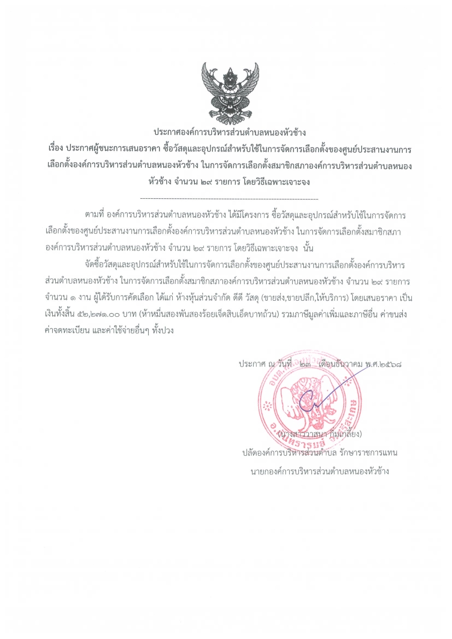 ประกาศองค์การบริหารส่วนตำบลหนองหัวช้าง เรื่อง ประกาศผู้ชนะการเสนอราคาซื้อวัสดุและอุปกรณ์สำหรับใช้ในการจัดการเลือกตั้งของศูนย์ประสานงานการเลือกตั้งองค์การบริหารส่วนตำบลหนองหัวช้าง ในการจัดการเลือกตั้งสมาชิกสภาองค์การบริหาราส่วนตำบลหนองหัวช้าง จำนวน 29 รายการ โดยวิธีเฉพาะเจาะจง