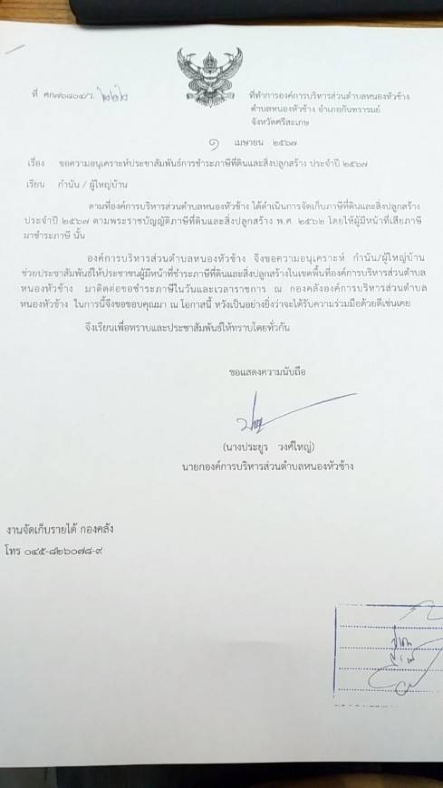 ประกาศองค์การบริหารส่วนตำบลหนองหัวช้าง เรื่องให้เจ้าของป้าย ที่ดินตั้งในเขตองค์การบริหารส่วนตำบลหนองหัวช้างไปยื่นแบบแสดงรายการและชำระภาษี ประจำปี พ.ศ.พ.ศ.2569