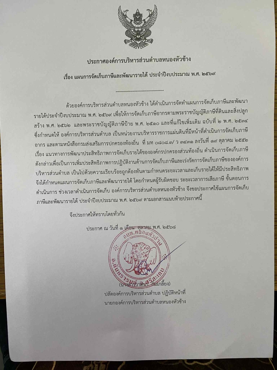 ประกาศองค์การบริหารส่วนตำบลหนองหัวช้าง วันพุธ, 15 ตุลาคม 2568 09:49 Print Email ประกาศองค์การบริหารส่วนตำบลหนองหัวช้าง เรื่อง แผนการจัดเก็บภาษีและพัฒนารายได้ ประจำปีงบประมาณ พ.ศ.2569 ดาวน์โหลดเอกสาร (3 Downloads) back to top