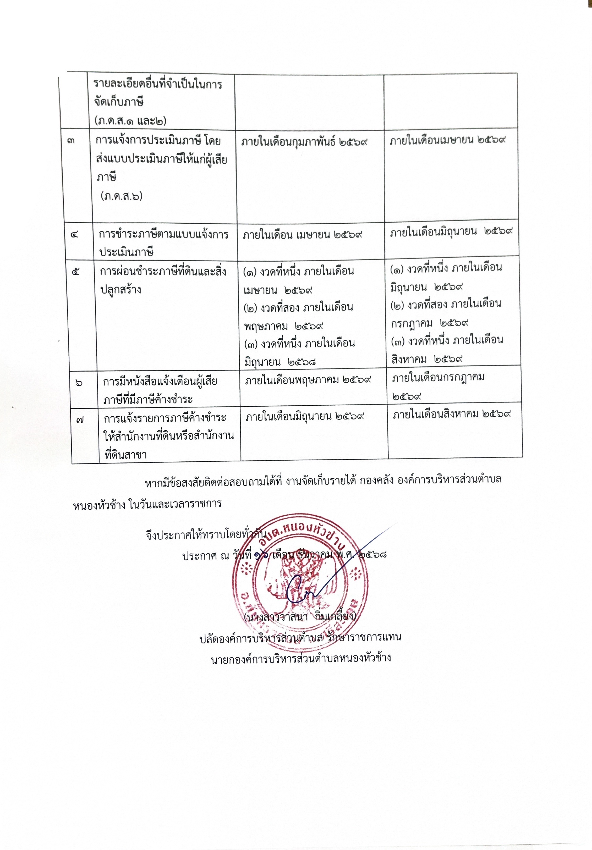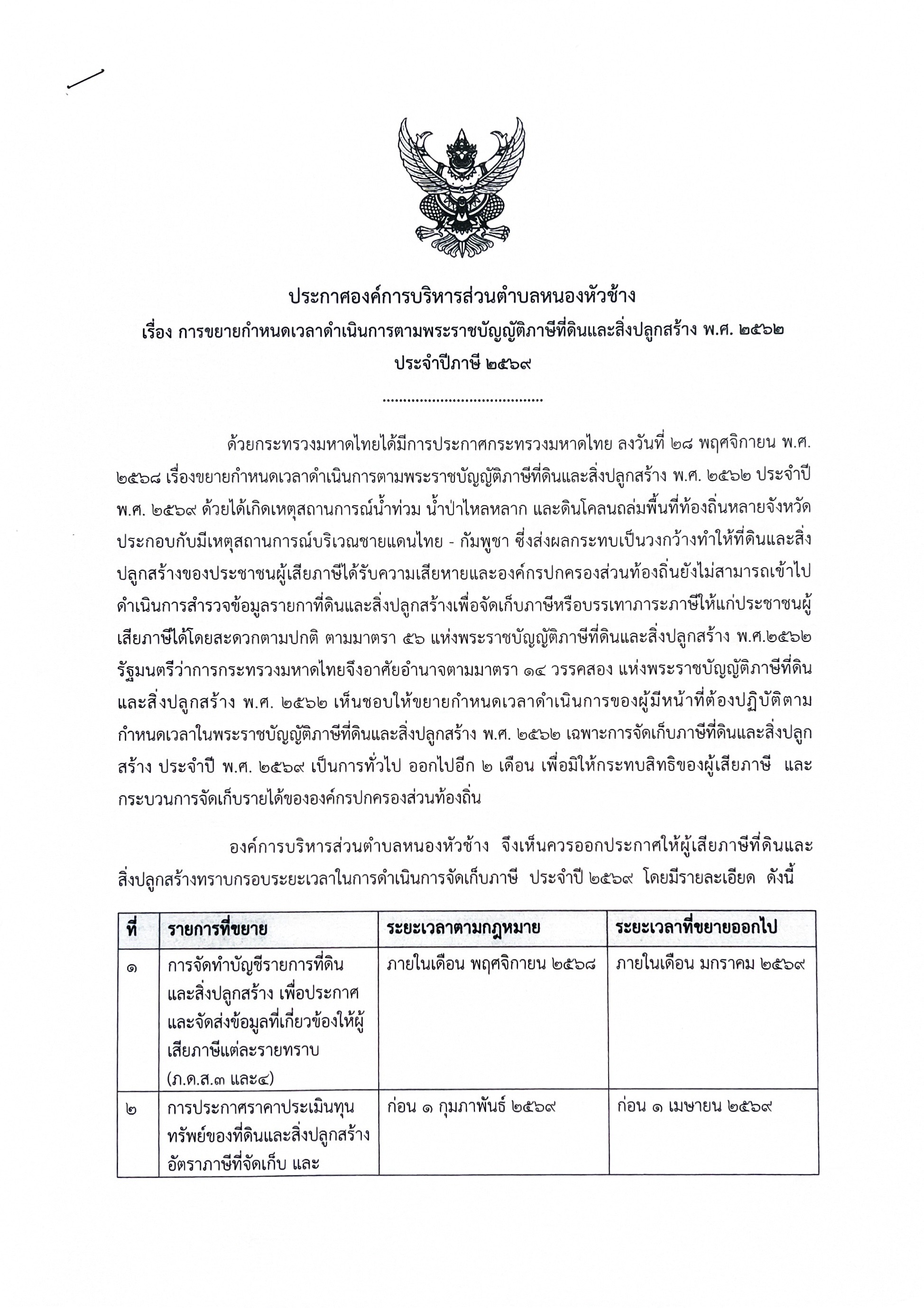 ประกาศองค์การบริหารส่วนตำบลหนองหัวช้าง เรื่อง การขยายกำหนดเวลาดำเนินการตามพระราชบัญญัติภาษีที่ดินและสิ่งปลูกสร้าง พ.ศ.2562 ประจำปีภาษี 2569