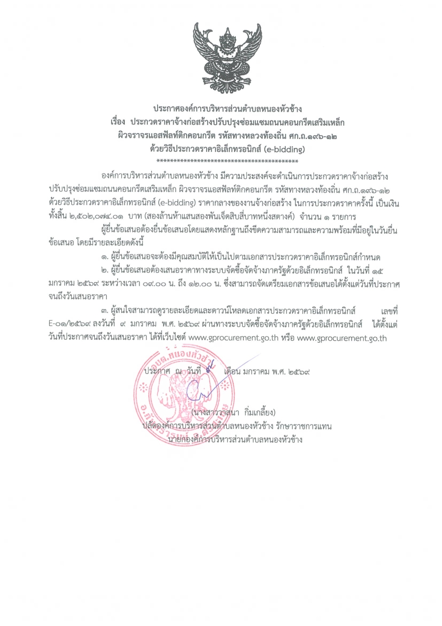 ประกาศองค์การบริหารส่วนตำบลหนองหัวช้าง เรื่อง ประกวดราคาจ้างก่อสร้างปรับปรุงซ่อมแซมถนนคอนกรีตเสริมเหล็กผิวจราจรแอสฟัลท์ติกคอนกรีต รหัสทางหลวงท้องถิ่น ศก.ถ. 196-12 ด้วยวิธีประกวดอิเล็กทรอนิกส์ (e-bidding)